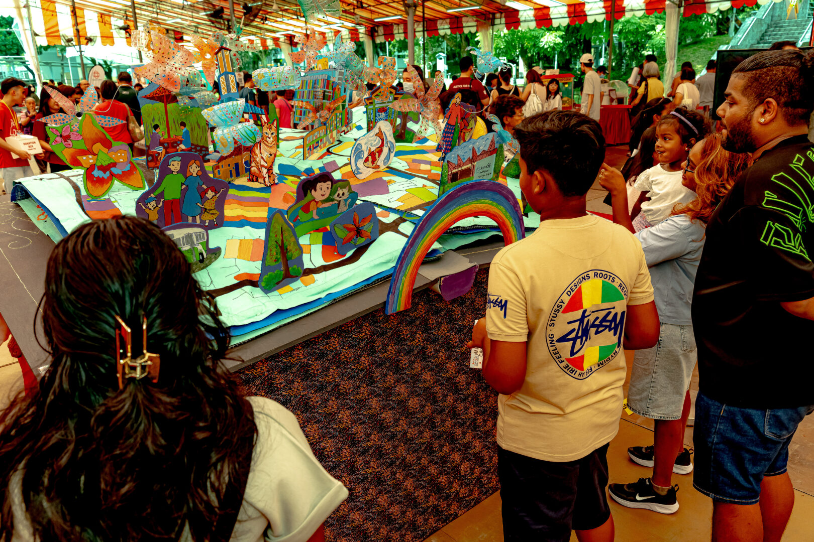 This year’s festival theme, Neighbourhood Gems, is brought to life through the vivid pages of the open-book artwork, which features familiar local landmarks like the clocktower, Serangoon Community Club, and Stadium. Adding a personal touch is a striking cat figure, symbolising Serangoon’s lively, pet-friendly culture, known for its many pet shops and veterinary clinics.