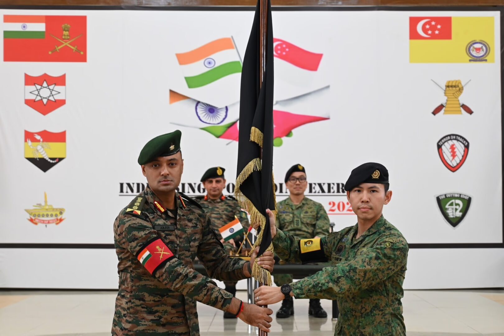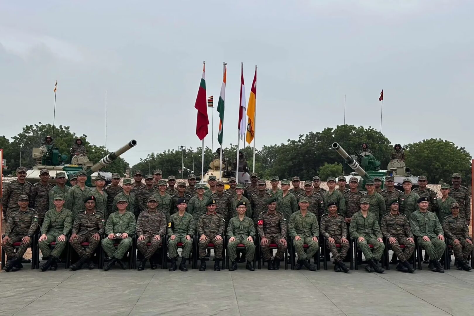 The Singapore Army’s Deputy Chief Armour Officer, Colonel Andy Quek (second from right) and Indian Army’s Brigadier-General Pritam, Commander 340th (Independent) Mechanised Brigade (second from left), co-officiating the closing ceremony. Image: MINDEF