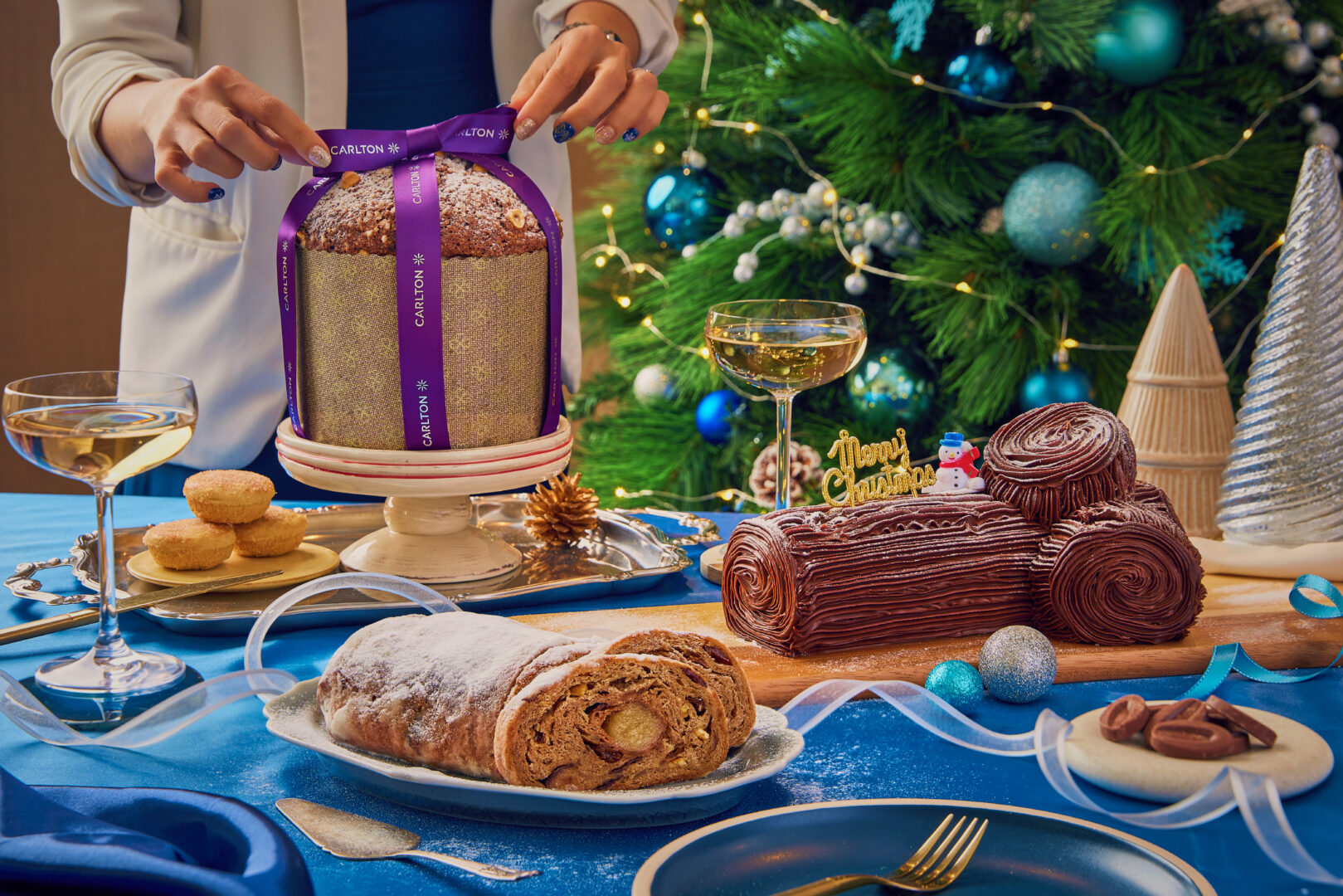 The season’s sweetest moments are reflected in the hotel’s festive desserts. To complement the savouries, Carlton Hotel Singapore introduces the new Berry Mochi Delight ($78, 1kg), a playful twist on the classic log cake with a chewy mochi, tangy blueberry compote, fluffy light sponge, airy lemon cream cheese and a delicate crumble base. Guests can also look forward to the hotel’s handcrafted Hazelnut Chocolate Panettone ($38, 500g), a decadent spin on the Italian classic enriched with nuts and Valrhona chocolate, as well as the Christmas Stollen ($38, 450g), Handcrafted Bonbon ($18, 8 pieces) and more. These offerings not only provide the holiday indulgence to complete any festive table, they are also perfect for gifting.