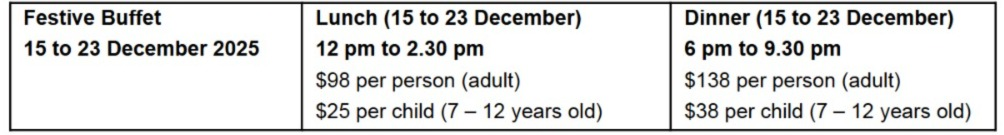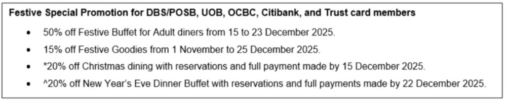 ● From 1 November 2025 to 25 December 2025, selected bank card members will enjoy 15% off all Festive Takeaway Goodies.