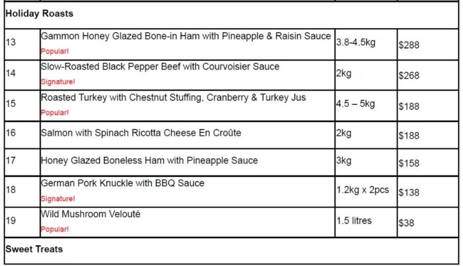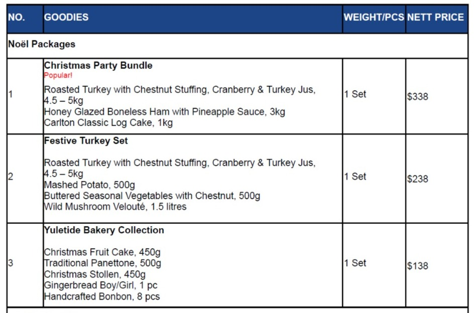 Please refer to Appendix A for the complete list of Festive Takeaways. All prices are in Singapore Dollars