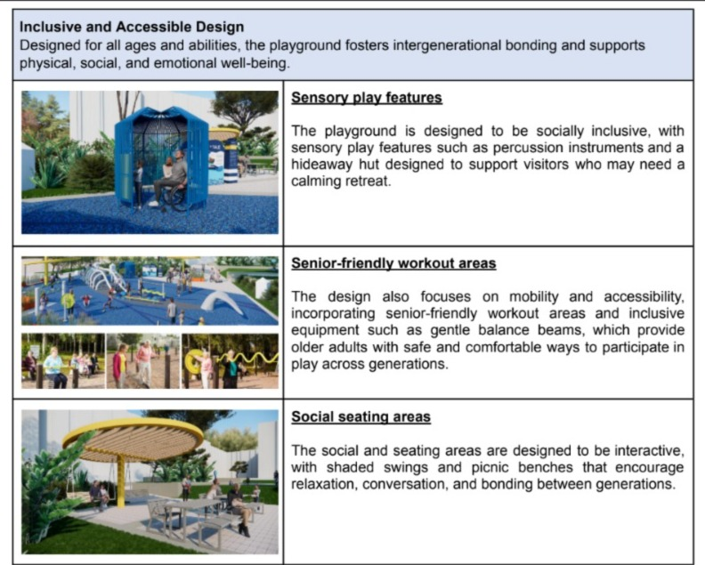 The playground is built for people of all ages and abilities with accessible equipment that has features attuned to the needs of both young and old, and encourages intergenerational bonding. This includes senior-friendly workout areas, sensory play features, and picnic benches for everyone to enjoy.