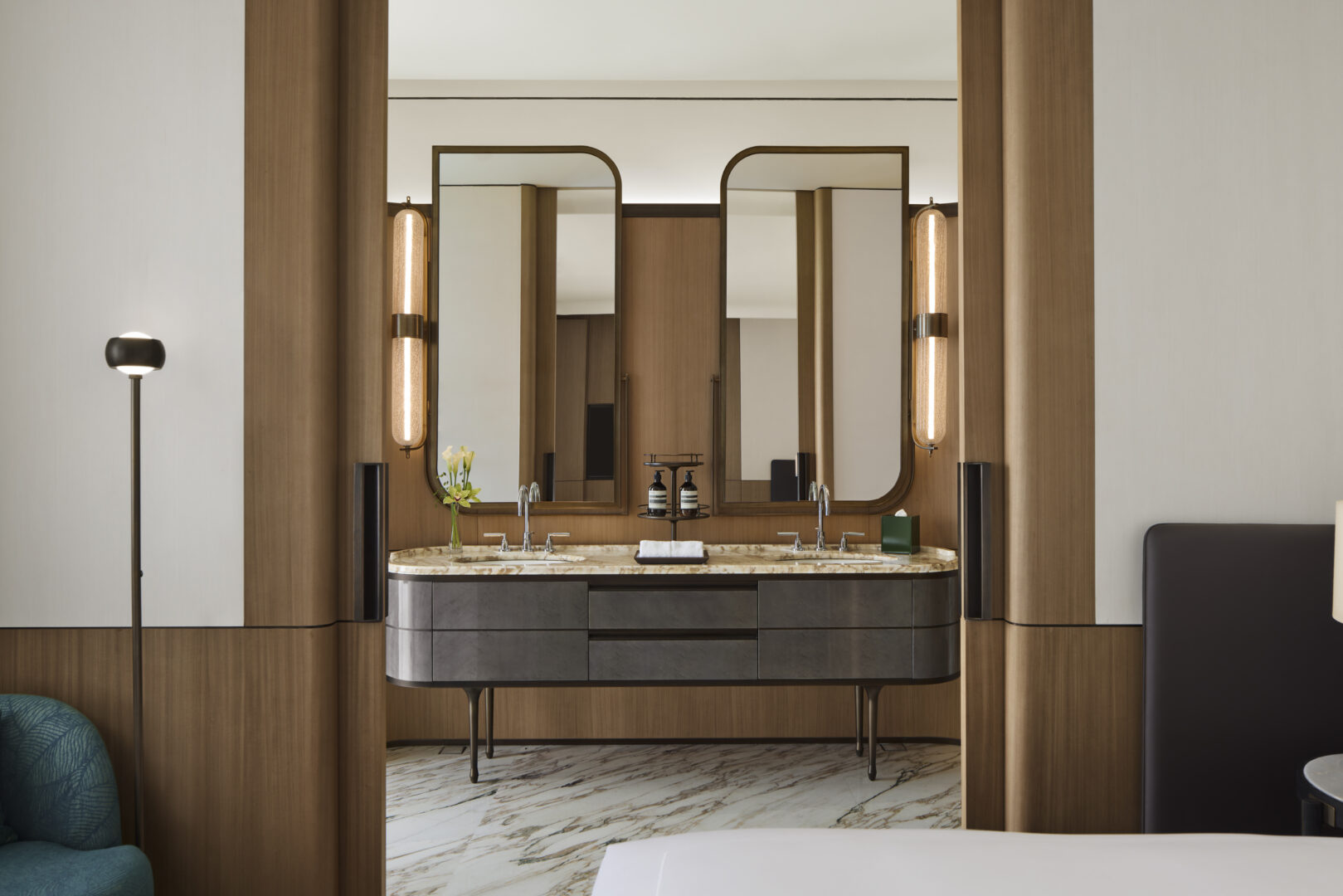 At the heart of the hotel, Peacock Alley pays homage to the legendary lounge at the newly reopened Waldorf Astoria New York – the iconic venue where the glamorous gathered to see and be seen. Seated along floor-to-ceiling windows with views of greenery and the river, it offers a refined setting for connection, celebration and indulgence. The space also features two interactive preparation areas, a beverage bar and a pastry station, where specialty teas and coffees are crafted and desserts receive their final flourishes, offering guests engaging culinary experience around the clock.