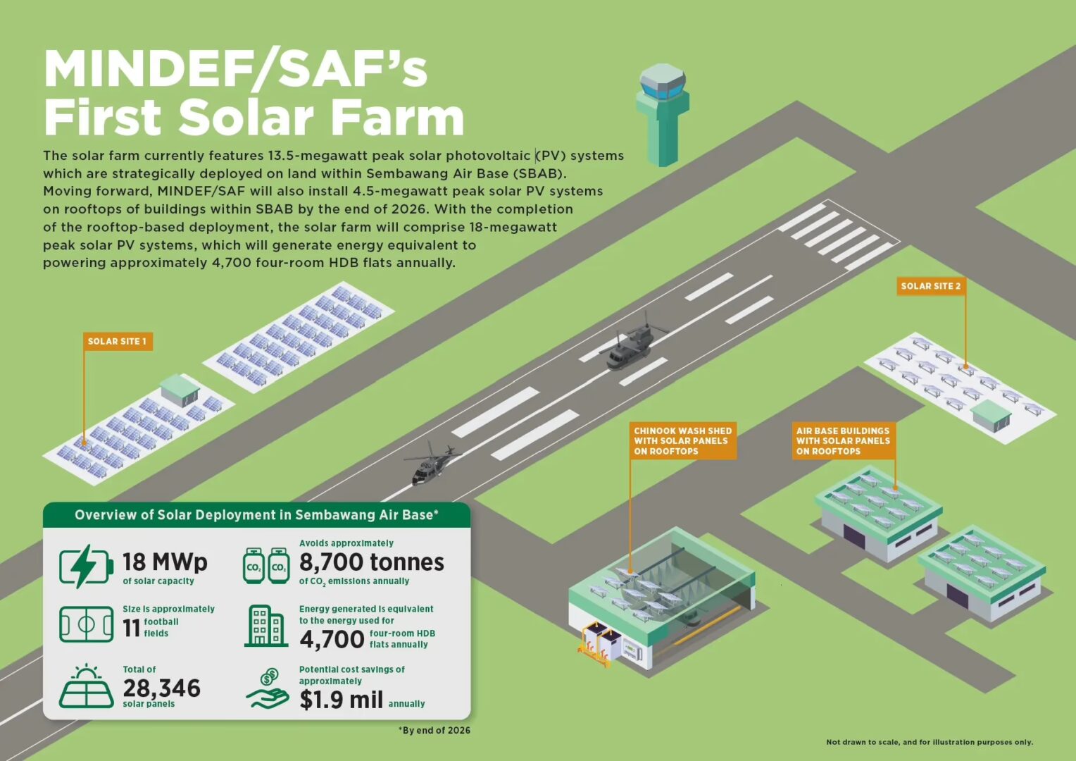 Beyond Sembawang Air Base, MINDEF/SAF plans to install about 13.5MWp of solar PV systems across other SAF camps and bases by end-2027. This will raise total solar deployment across all MINDEF/SAF facilities to approximately 68MWp.