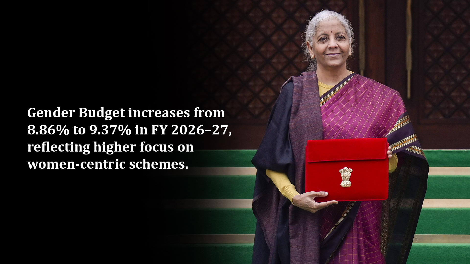 The Gender Budget accounts for 9.37% of the total Union Budget in FY 2026–27, compared to 8.86% in the previous year. The ₹5 lakh crore allocation for women and girls, an 11.36% rise, is intended to strengthen access to health, nutrition, education, livelihoods, and care services.