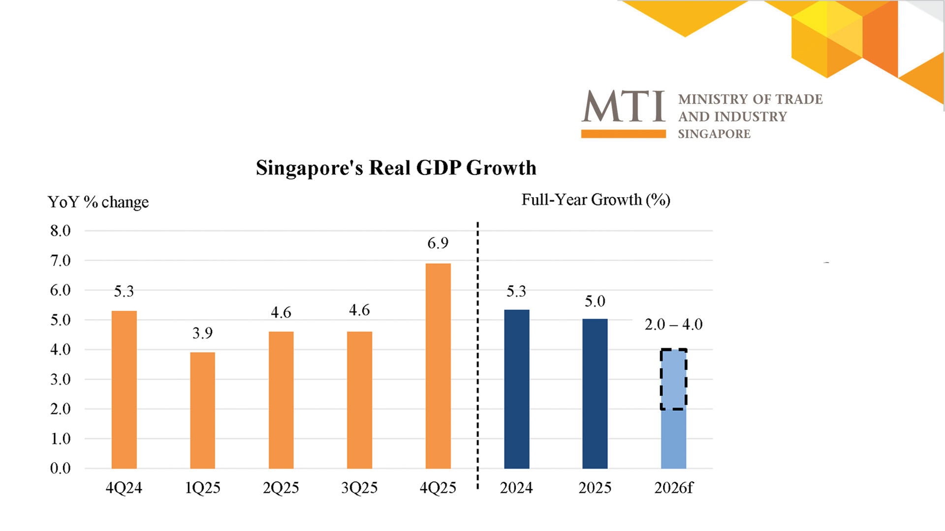 The Ministry of Trade and Industry (MTI) announced on 10 February 2026 that Singapore’s economy grew by 5.0 per cent in 2025 and that the country’s GDP growth forecast for 2026 has been upgraded to between 2.0 and 4.0 per cent .