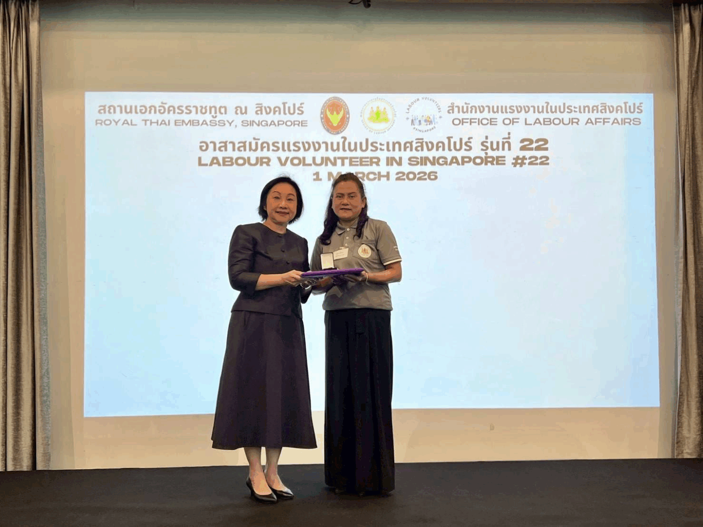 The Royal Thai Embassy in Singapore hosted the 22nd Overseas Thai Labour Volunteer Training Programme on 1 March 2026 at the Embassy premises. The programme was organised by the Labour Affairs Office Singapore to strengthen engagement with Thai labour volunteers and enhance support networks for the Thai community in Singapore.