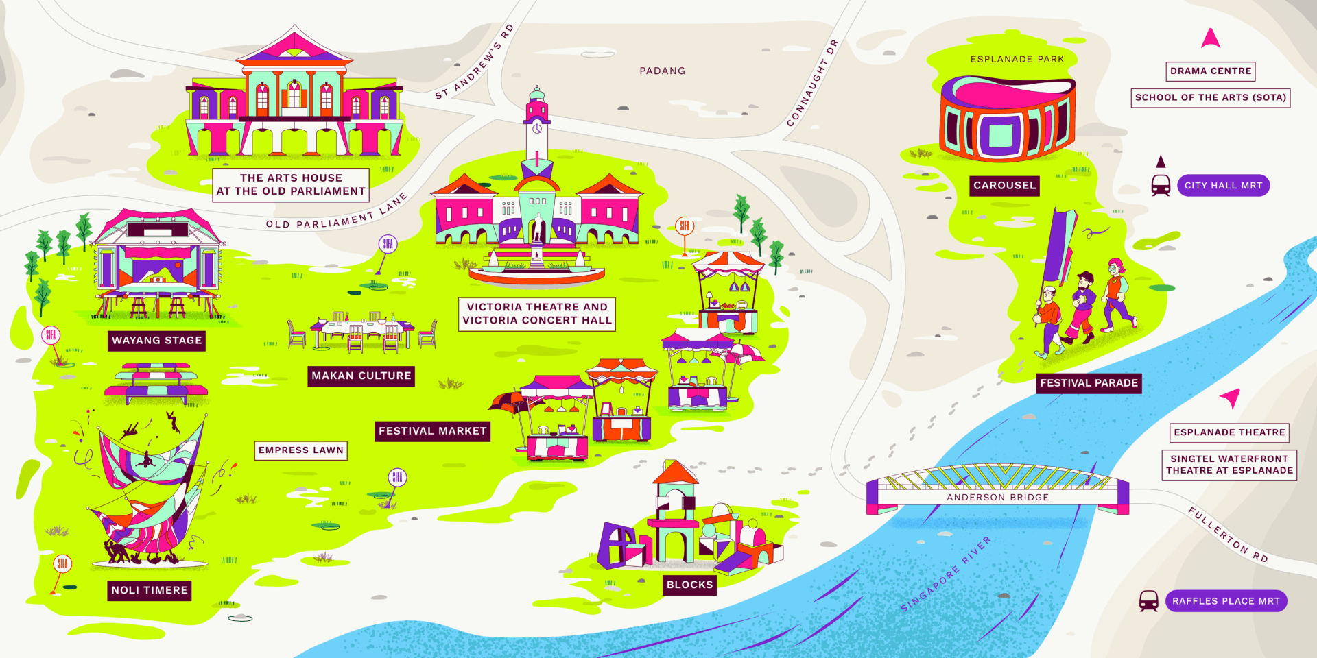A key highlight of the festival is the return of the Festival Village at Empress Lawn extending to Anderson Bridge, which will serve as a public hub for performances, installations, and interactive experiences. The programme will include works such as Just Keep Swimming, Just Keep Swimming by The Theatre Practice, the sound installation RUPTURE by The Observatory, and an interactive food-themed performance space titled Makan Culture.