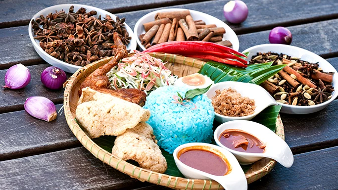 Among the most iconic is nasi lemak, widely regarded as Malaysia’s national dish. Fragrant coconut rice is served with sambal, anchovies, peanuts and egg, with optional additions such as fried chicken or rendang. Equally distinctive is nasi kerabu, known for its naturally blue rice coloured with butterfly pea flowers and accompanied by herbs, salted egg and grilled proteins.